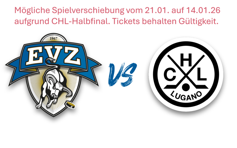 >>> Possible postponement of EVZ vs. HC Lugano game: EVZ has qualified for the CHL semi-final. If the CHL home game is scheduled for January 13, 2026, the NL home game against Lugano will be postponed from January 21, 2026, to January 14, 2026. Tickets that have already been purchased remain valid.